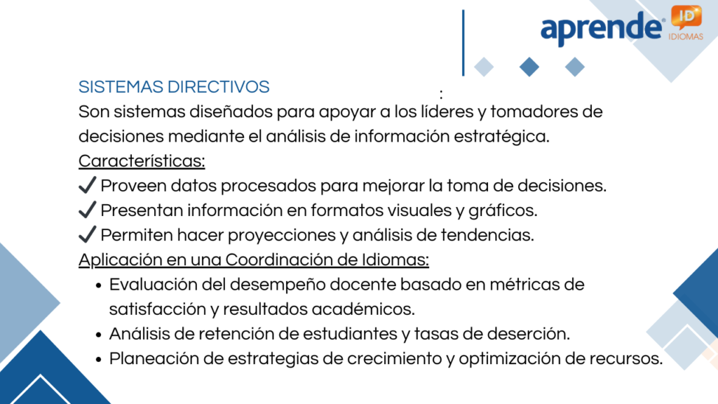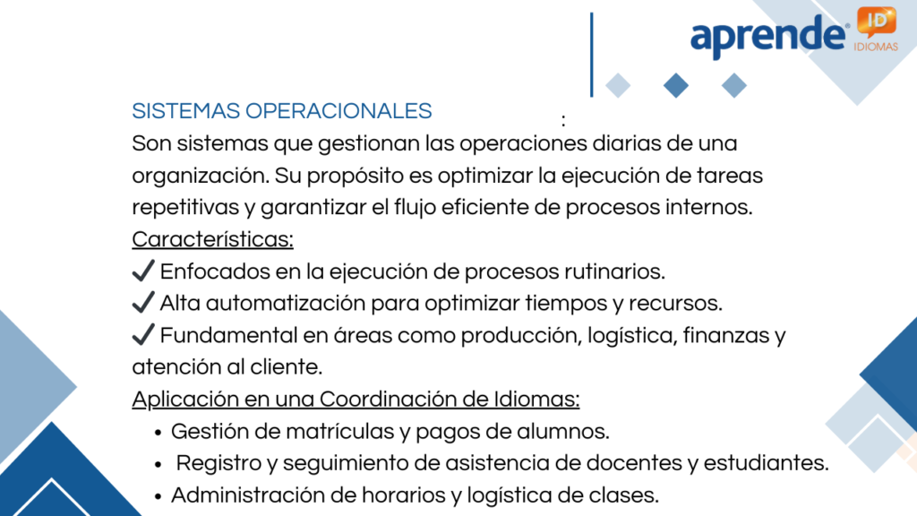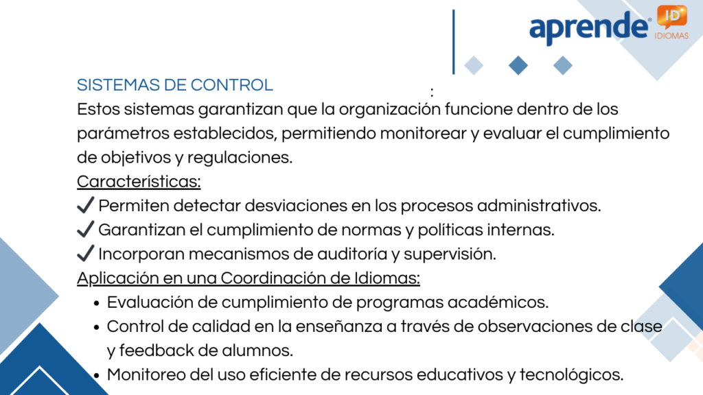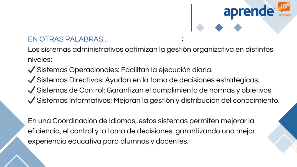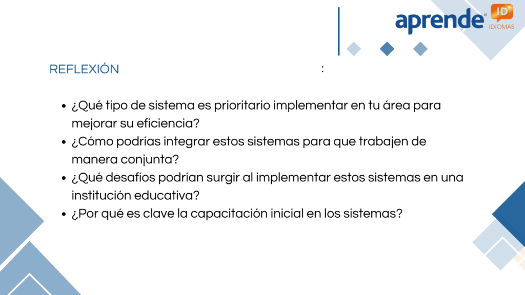 En una institución educativa, un sistema incluye maestros, alumnos, personal administrativo, materiales, metodologías, etc. Todo en conjunto funciona para un mismo objetivo. En la medida en la que identifiques cada área y cómo funcione, podrás tener mejores resultados. Recuerda que buscamos las 3Effs (effective, efficient, effortless).